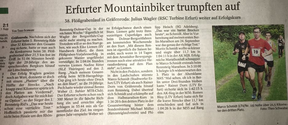 Beim Flößgrabenlauf in Gräfenroda starteten mit Marco Schmidt und Rainer Dorn zwei weitere Leistungsträger des LTV. Marco Schmidt belegte über den 3. Platz in der Gesamtwertung und war sichtlich zufrieden mit der Generalprobe vor dem Berlin-Marathon.