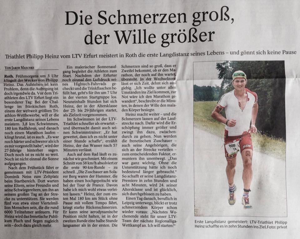 Über noch eine Meisterleistung unserer Athleten berichtet heute die Thüringer Allgemeine: Philipp Heinz beendet seine erste Langdistanz beim legendären Challenge Roth. Mit Stefan Breithaupt vertritt ein weiterer Athlet unsere Vereinsfarben in Roth.
